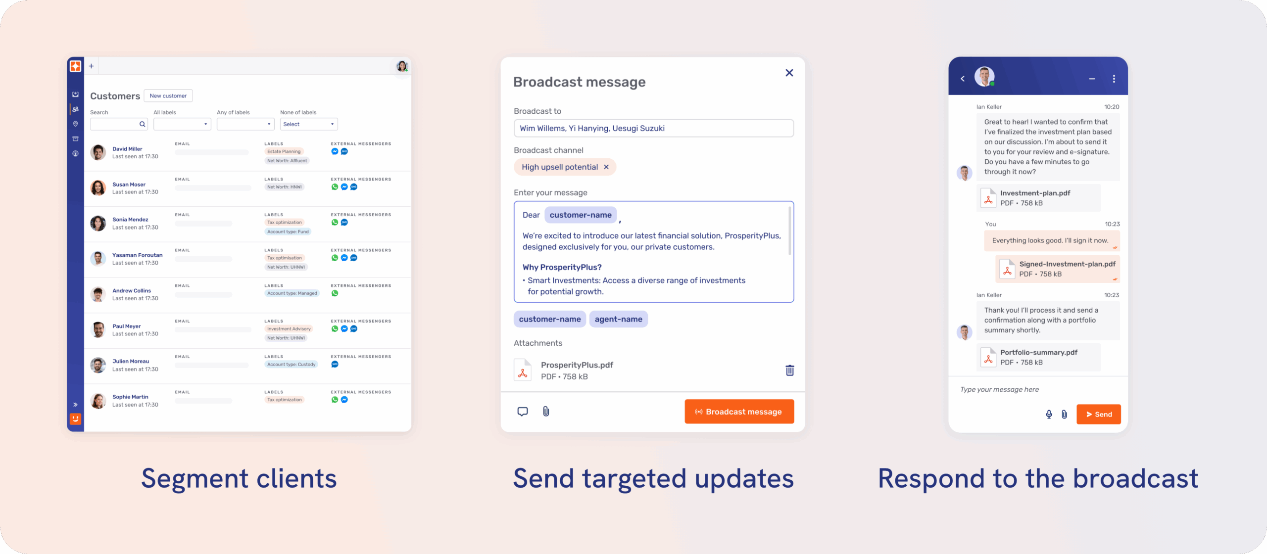 These messages, tailored to client interests, initiate an ongoing, one-on-one conversation thread. For specialized support, advisors can seamlessly add experts (e.g., investment, legal, or tax specialists) to focused breakout chats.