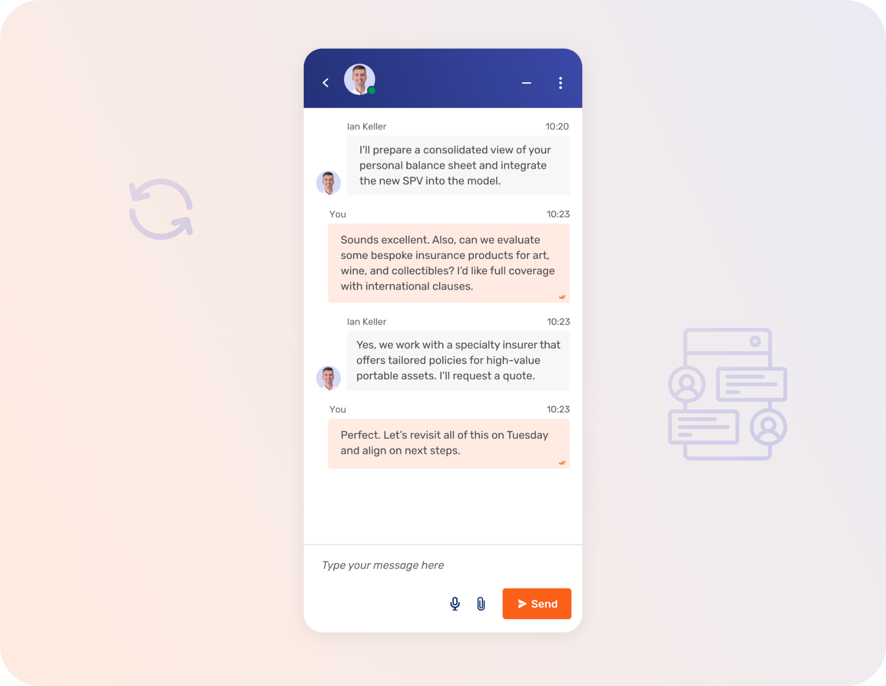 Stay consistently connected through in-app Secure Messenger, allowing clients and advisors to communicate on their own time while maintaining context.
