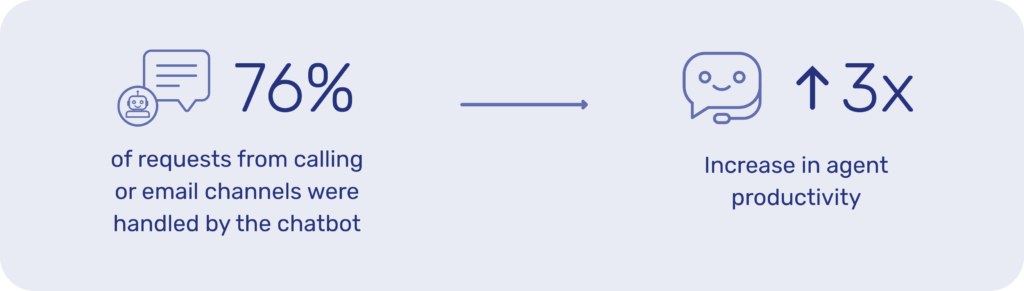 For one Unblu customer, 76% of requests from calling or email channels were handled by the chatbot – leading to a 3X increase in agent productivity.