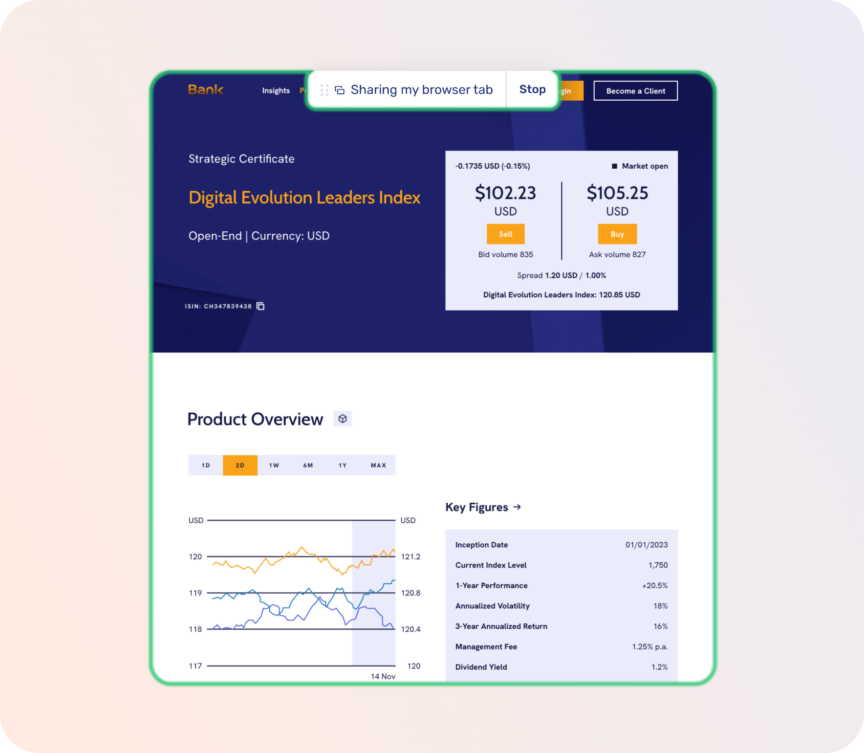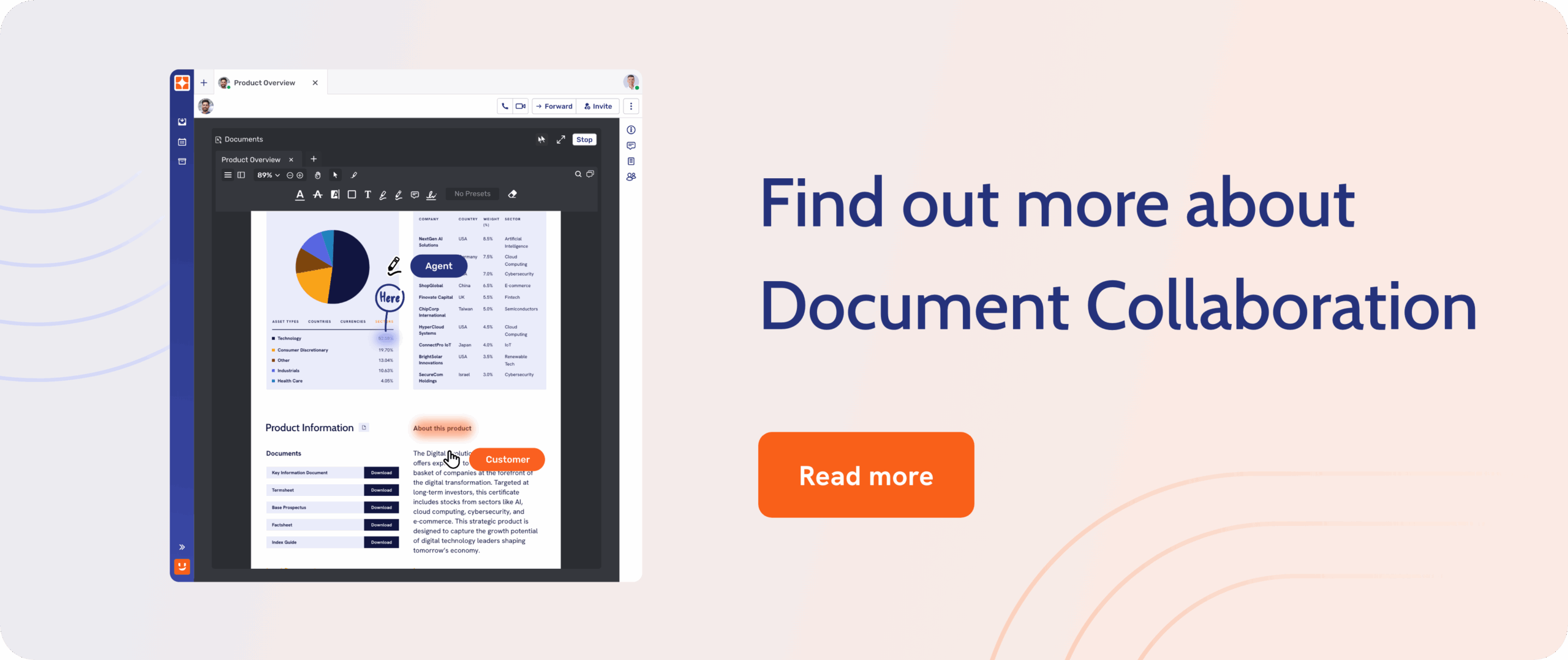 Unblu’s collaboration tools offer unique capabilities across different contexts, whether Embedded Co-Browsing for desktop research, Co-Apping for a mobile-native collaboration experience in the app or wealth portal, or Document Collaboration.