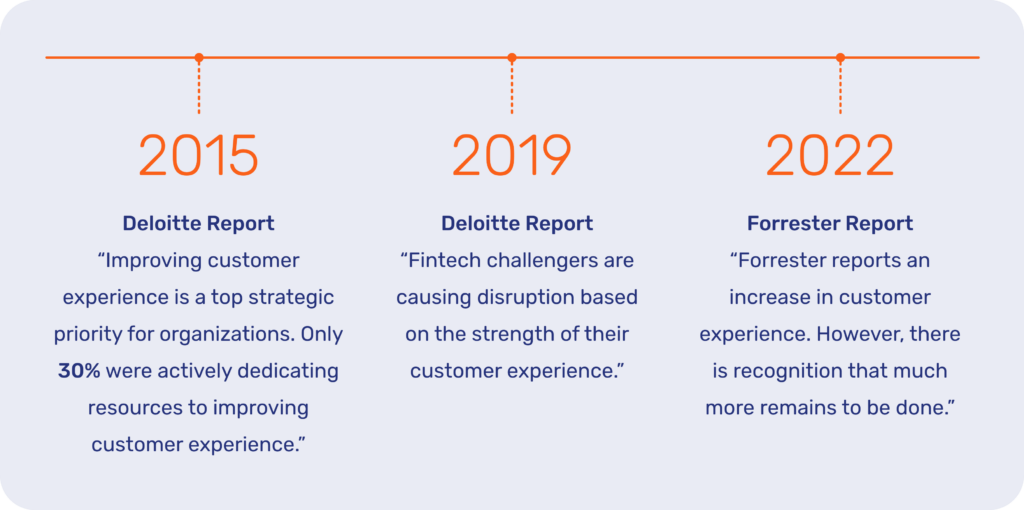 In 2015, Deloitte reported that improving the customer experience is a top strategic priority for organizations, and yet only 30% were actively dedicating resources to improving it. In 2019, another Deloitte report talks about how fintech challengers are causing disruption on the strength of their customer experience. In 2022, Forrester reports that there’s an increase in customer experience – but that much more remains to be done.