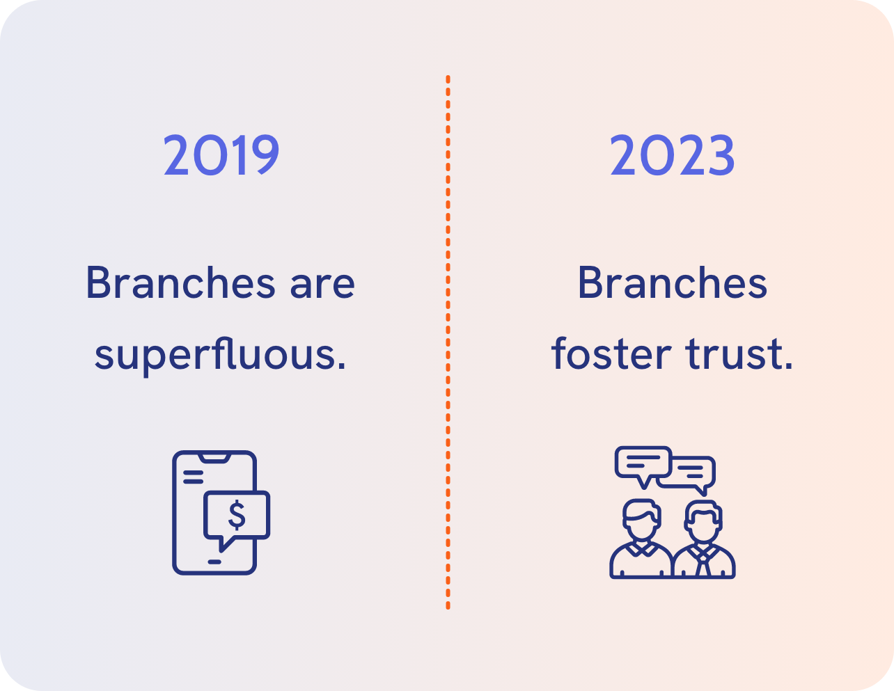 It isn’t just customer self-reports that back up the connection between a strong branch network and customer trust. When Silicon Valley Bank announced it needed to raise 2.25 billion dollars in 2023, customers instantly lost trust and withdrew 42 billion dollars in deposits almost immediately. This crisis wasn’t contained to one bank, with the panic spreading around the globe and resulting in market losses of 120 billion euros in Europe alone.