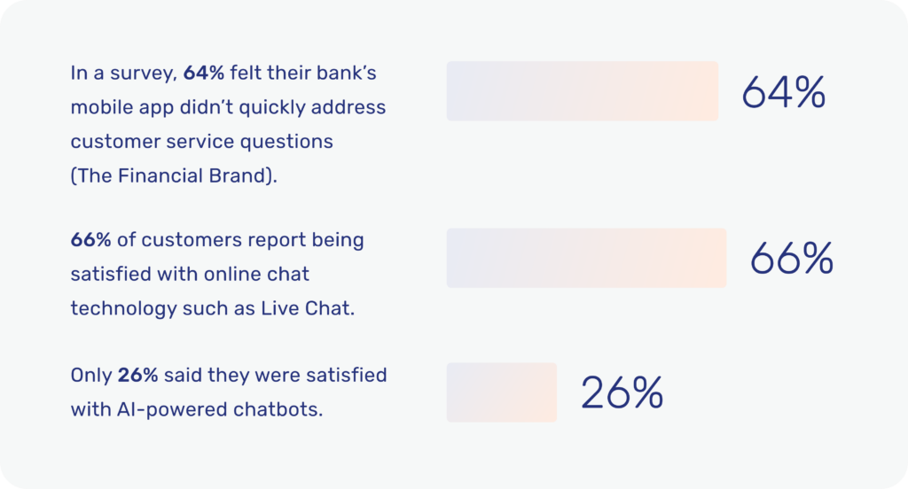 But one specific area of customer service has had a more turbulent relationship with customers than most. While 66% of customers report being satisfied with online chat technology such as Live Chat, only 26% said they were satisfied with AI-powered chatbots. Another survey found that 80% of customers who have used chatbots to inquire about financial products would prefer to not use them again.