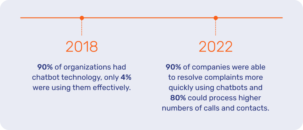 Whatever the reason, there were widespread teething issues that affected customer satisfaction and perception. What’s more, to a large extent, these issues are in the past. Fast forward to 2022 and a Deloitte survey found that around 90% of companies were able to resolve complaints more quickly using chatbots and 80% could process higher numbers of calls and contacts.