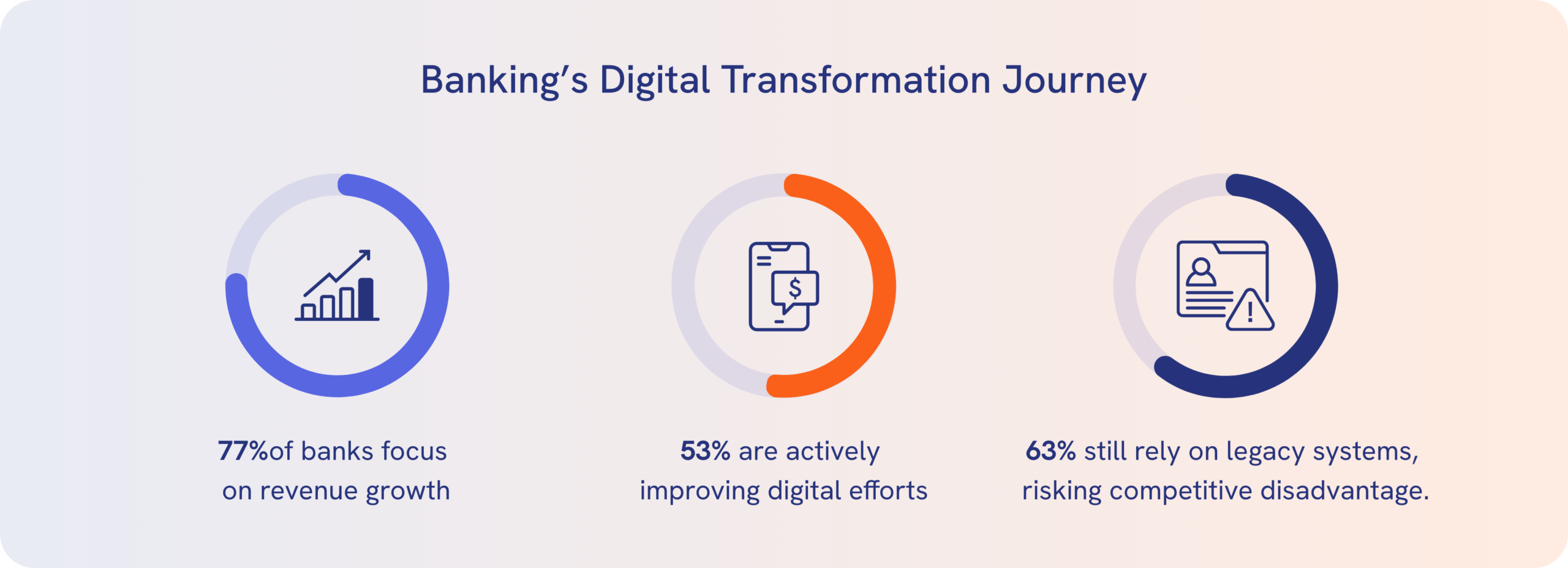 Despite growing investments, even as we approach 2025, approximately 60% of financial institutions are still in the early stages of their digital transformation journeys, relying on legacy systems that are incapable of providing a competitive edge. This is because many have decided to follow a piecemeal rather than a holistic approach. This delay poses significant risks of falling behind digitally native competitors (Digital Banking Report).