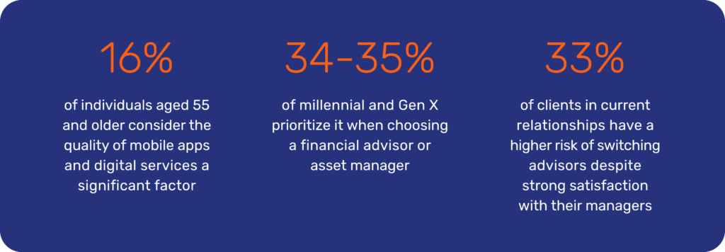 Younger generations believe the quality of mobile apps and digital services to be more important than older generations. Whereas only 16% of 55 year olds and up believe it to be a significant factor, 34% and 35% of millennial and Gen X investors respectively claim it is important when choosing a financial advisor or asset manager.