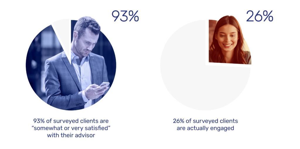 There is a direct correlation between engagement and profitability. However, despite reported high levels of client satisfaction, engagement is comparatively low. One report found that, while 93% of surveyed clients said they are “somewhat or very satisfied” with their advisor, only 26% are actually engaged.