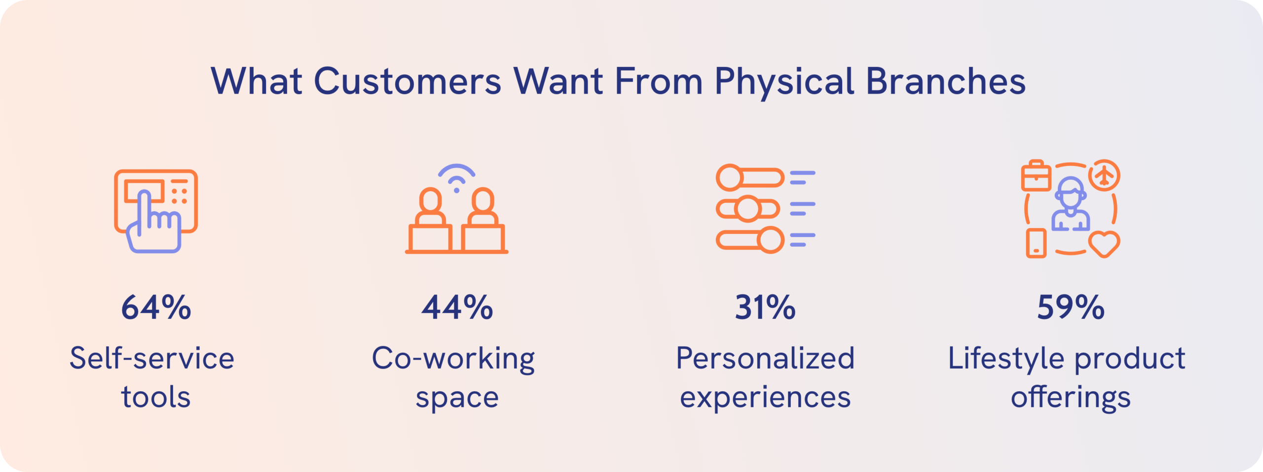 In terms of everyday uses, customers state that they would prefer more in-depth services at their physical branch locations. The most requested is self-service tools, with 64% of customers expressing a preference for them. Another 44% are leaning towards higher levels of co-working options, and 31% want a more immersive and personalized experience. What’s more, almost 59% of the respondents would respond to a higher offering of lifestyle products at their branch.