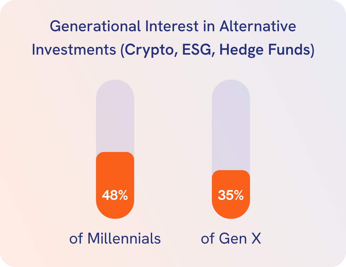 Gen X and Millennial wealth holders are showing increased interest in cryptocurrencies, ESG investments, hedge funds, and similar options, with a reported 48% of Millennials and 35% of Gen X claiming they’d like to discuss crypto investments with their financial advisors.