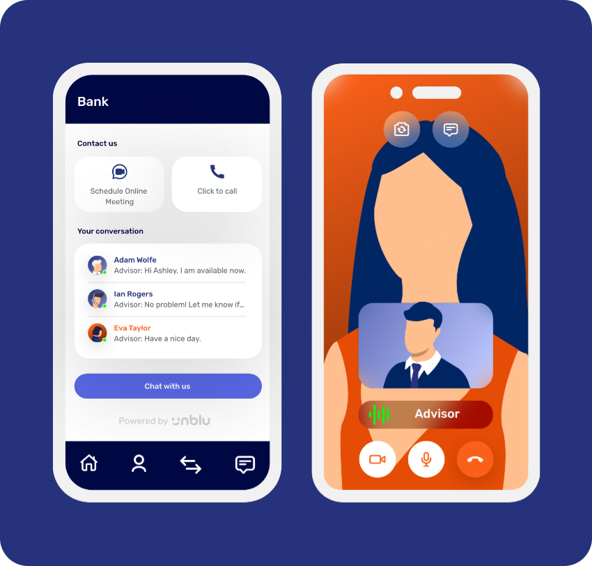 Firstly, advisors need to be able to move from messages to Video & Voice calls at a moment’s notice, no matter the channel. Unblu allows you to do this, without ever breaking the conversation flow or requiring the client to download.