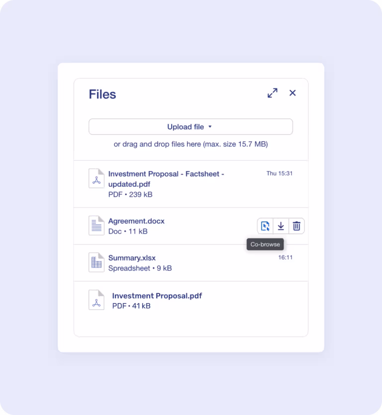Use Unblu’s built-in signing tool or integrate with your preferred e-signature provider for secure signatures even on sensitive documents.